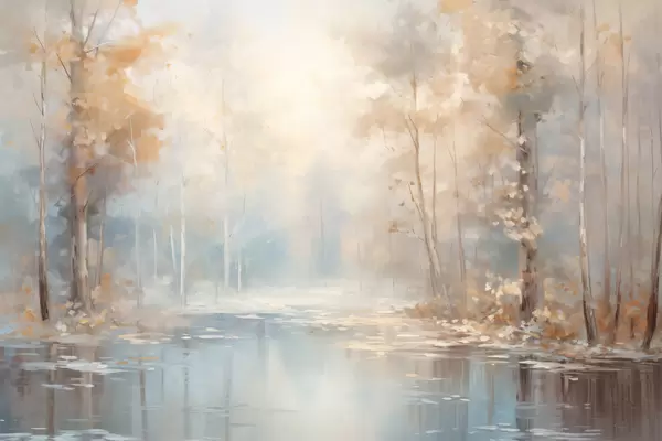 Poster Landschap olieverfschilderij imitatie van een kalme rivier die het zachte licht weerspiegelt, omringd door herfstbomen Nr f43167
