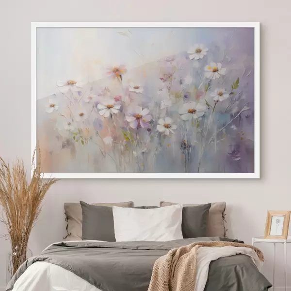 Poster Abstract structuurveld van witte en roze bloemen, zachte pastelkleuren, fijne penseelstreken, bloemenweide f43170
