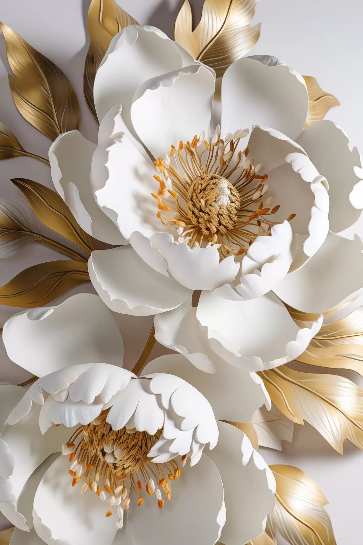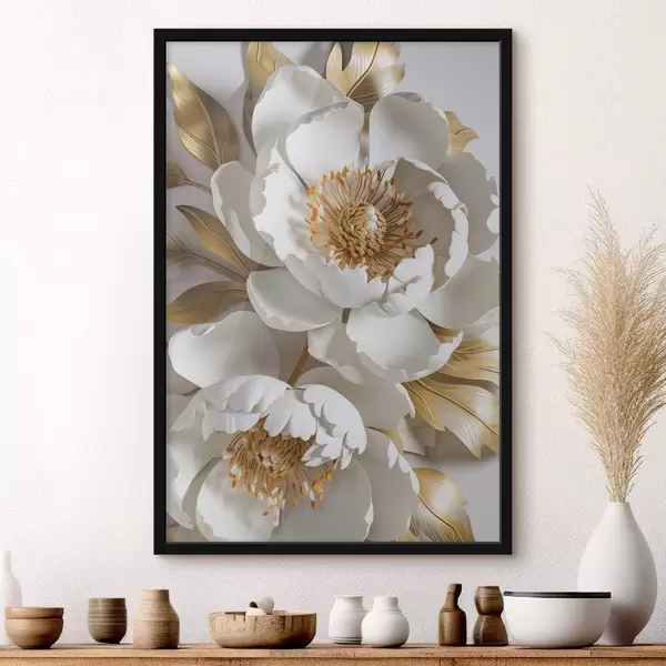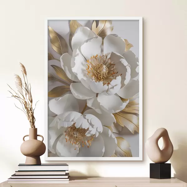 Poster Witte delicate gedetailleerde decoratieve pioenbloemen met gele bladeren, de achtergrond is een lichtgrijze kleur Nr f43176