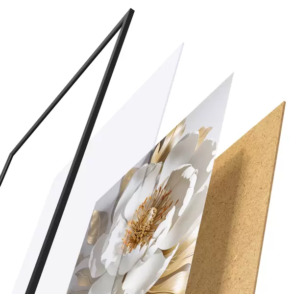 De poster bestaat uit een frame, plexiglas, geprinte afbeelding en spaanplaat achterkant. De poster kan meteen aan de muur worden gehangen dankzij de bevestigingen op de achterkant.