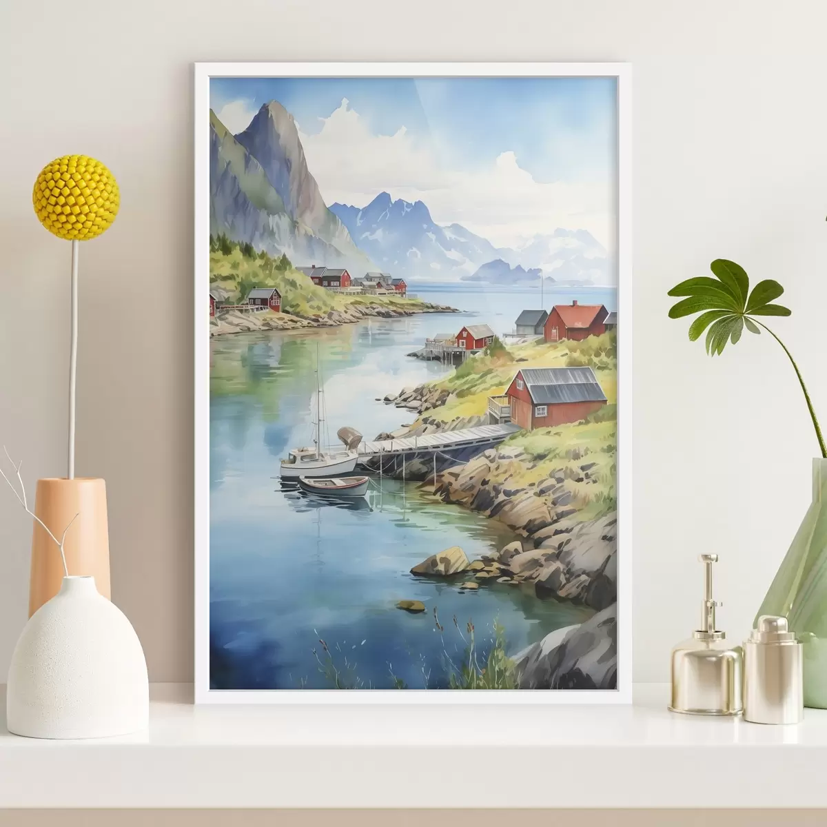 Poster Lofoten eilanden zomer landschap, rode huizen, bergen, boten Nr f43187