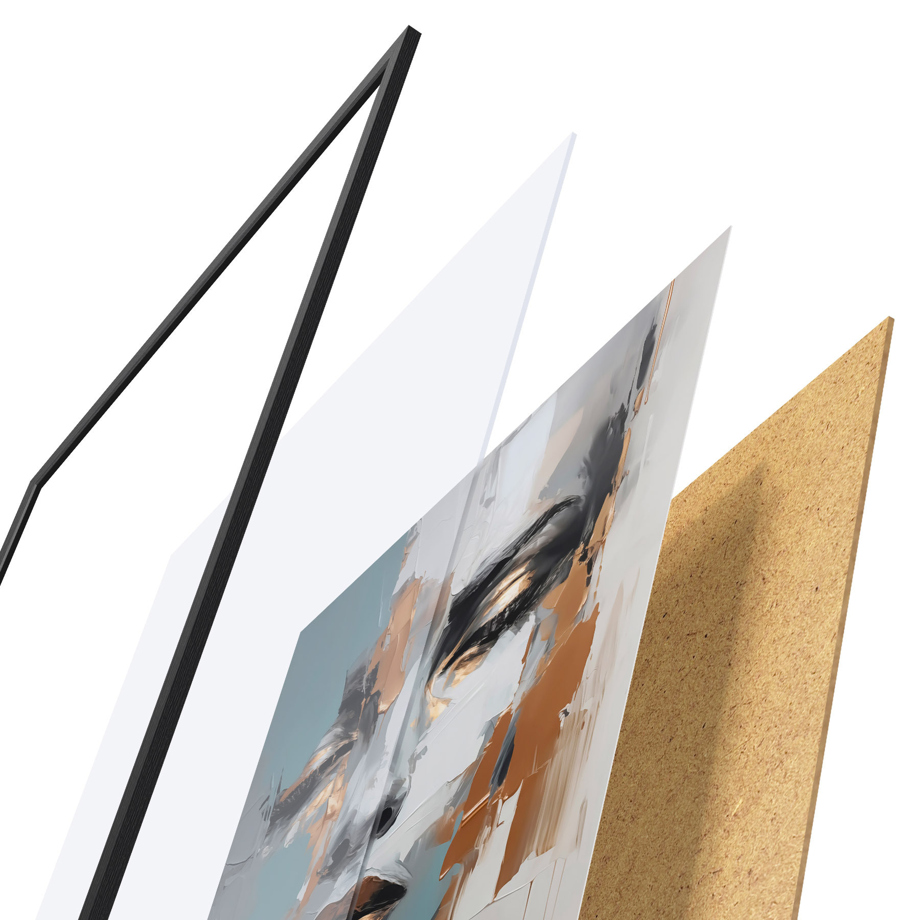 De poster bestaat uit een frame, plexiglas, geprinte afbeelding en spaanplaat achterkant. De poster kan meteen aan de muur worden gehangen dankzij de bevestigingen op de achterkant.
