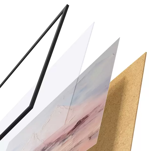 De poster bestaat uit een frame, plexiglas, geprinte afbeelding en spaanplaat achterkant. De poster kan meteen aan de muur worden gehangen dankzij de bevestigingen op de achterkant.