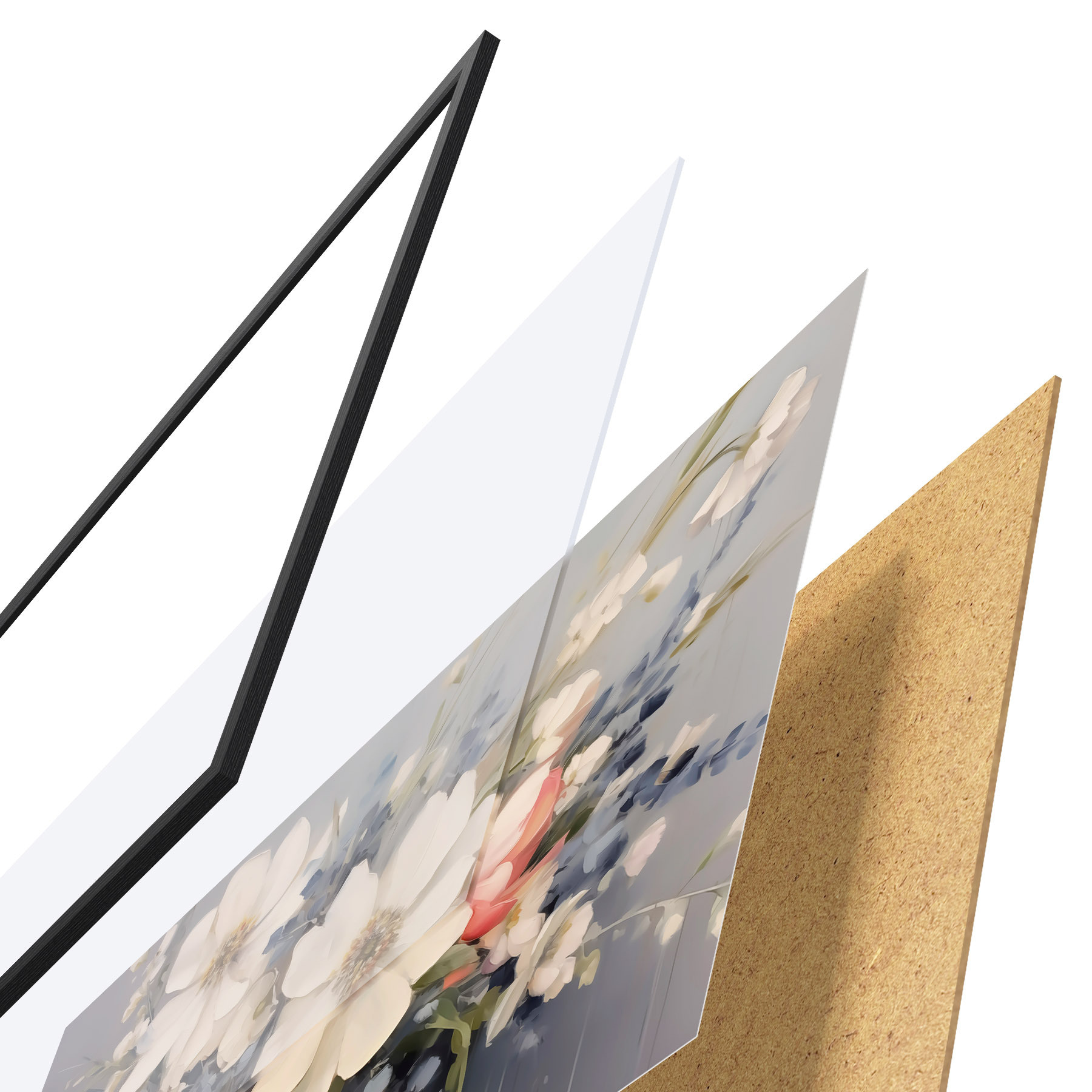 De poster bestaat uit een frame, plexiglas, geprinte afbeelding en spaanplaat achterkant. De poster kan meteen aan de muur worden gehangen dankzij de bevestigingen op de achterkant.