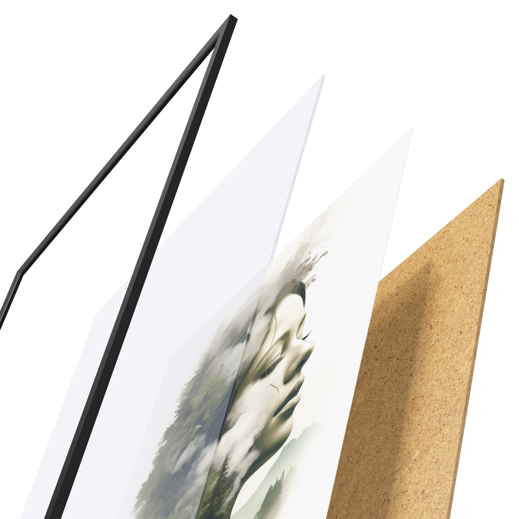 De poster bestaat uit een frame, plexiglas, geprinte afbeelding en spaanplaat achterkant. De poster kan meteen aan de muur worden gehangen dankzij de bevestigingen op de achterkant.