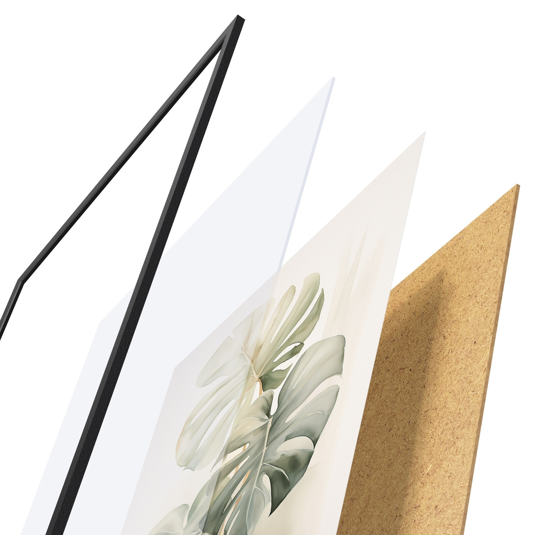 De poster bestaat uit een frame, plexiglas, geprinte afbeelding en spaanplaat achterkant. De poster kan meteen aan de muur worden gehangen dankzij de bevestigingen op de achterkant.