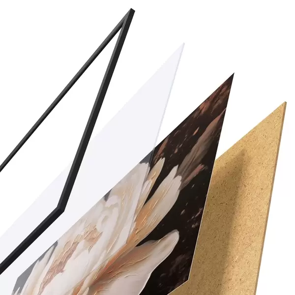 De poster bestaat uit een frame, plexiglas, geprinte afbeelding en spaanplaat achterkant. De poster kan meteen aan de muur worden gehangen dankzij de bevestigingen op de achterkant.