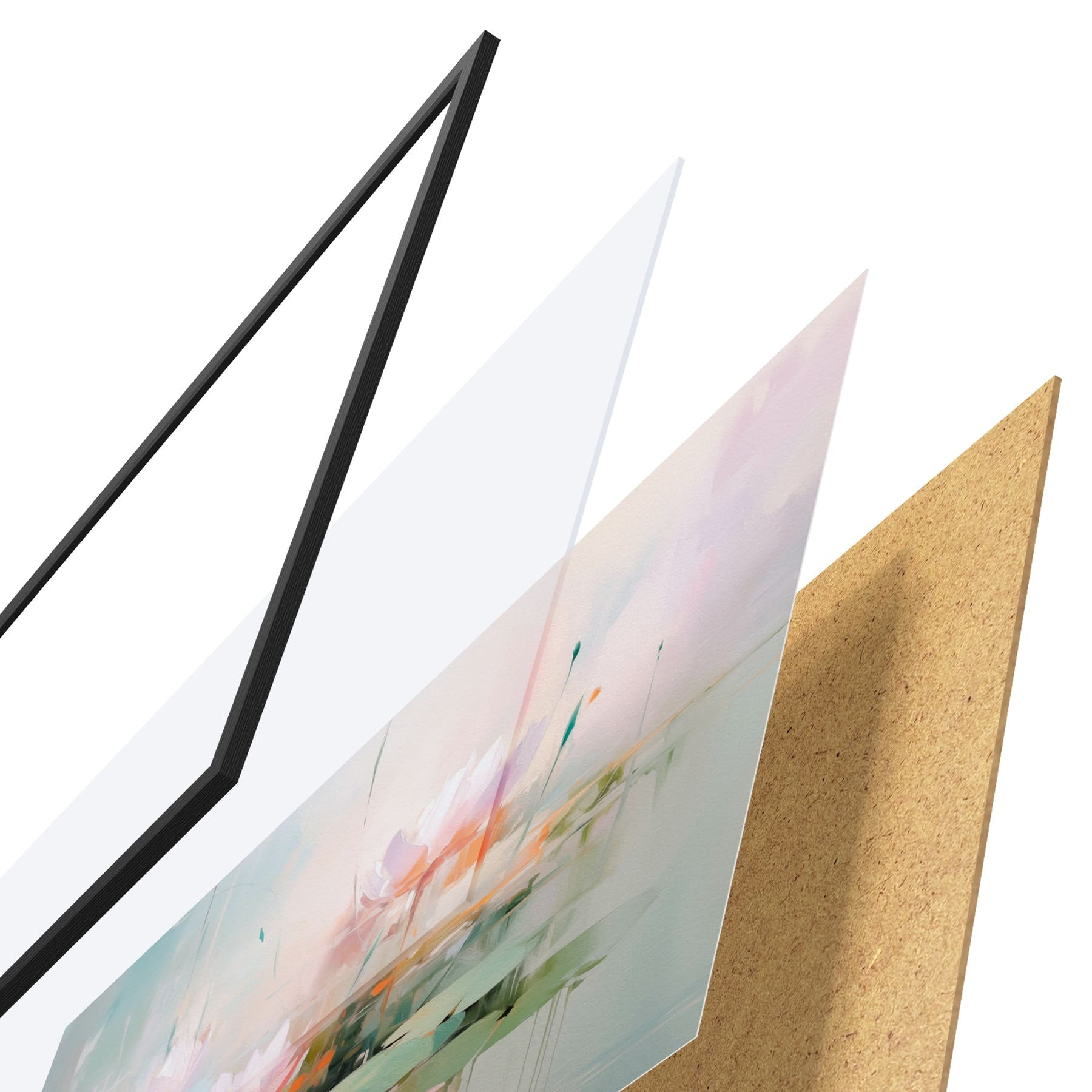 De poster bestaat uit een frame, plexiglas, geprinte afbeelding en spaanplaat achterkant. De poster kan meteen aan de muur worden gehangen dankzij de bevestigingen op de achterkant.