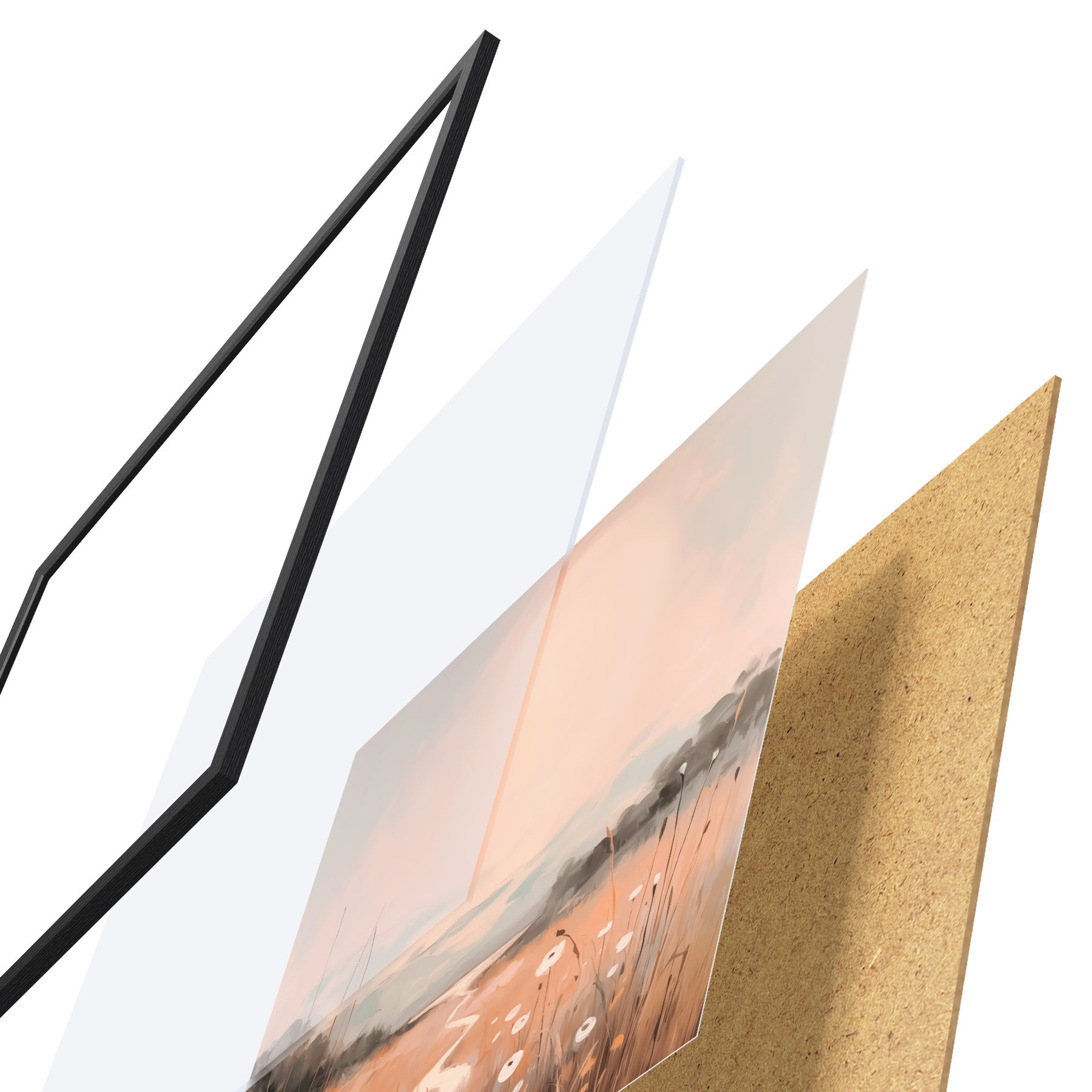 De poster bestaat uit een frame, plexiglas, geprinte afbeelding en spaanplaat achterkant. De poster kan meteen aan de muur worden gehangen dankzij de bevestigingen op de achterkant.
