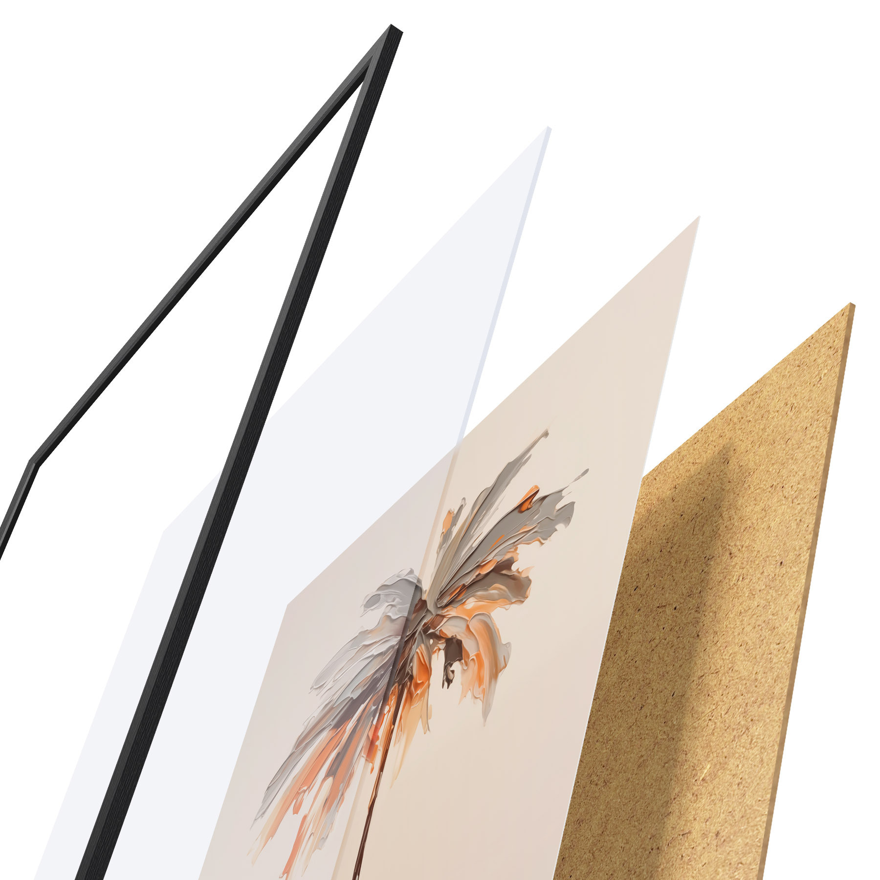De poster bestaat uit een frame, plexiglas, geprinte afbeelding en spaanplaat achterkant. De poster kan meteen aan de muur worden gehangen dankzij de bevestigingen op de achterkant.