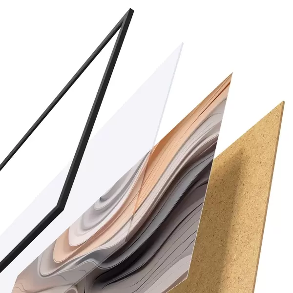 De poster bestaat uit een frame, plexiglas, geprinte afbeelding en spaanplaat achterkant. De poster kan meteen aan de muur worden gehangen dankzij de bevestigingen op de achterkant.