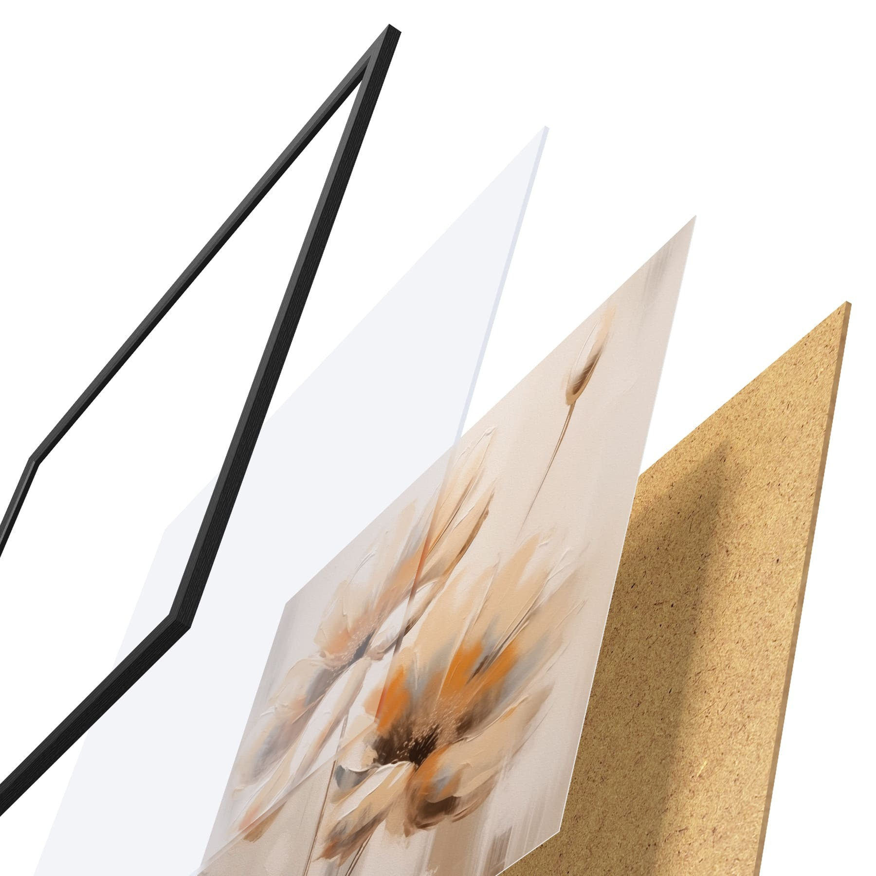 De poster bestaat uit een frame, plexiglas, geprinte afbeelding en spaanplaat achterkant. De poster kan meteen aan de muur worden gehangen dankzij de bevestigingen op de achterkant.