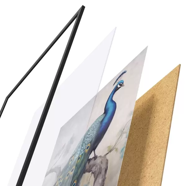 De poster bestaat uit een frame, plexiglas, geprinte afbeelding en spaanplaat achterkant. De poster kan meteen aan de muur worden gehangen dankzij de bevestigingen op de achterkant.