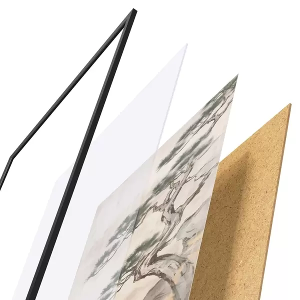De poster bestaat uit een frame, plexiglas, geprinte afbeelding en spaanplaat achterkant. De poster kan meteen aan de muur worden gehangen dankzij de bevestigingen op de achterkant.