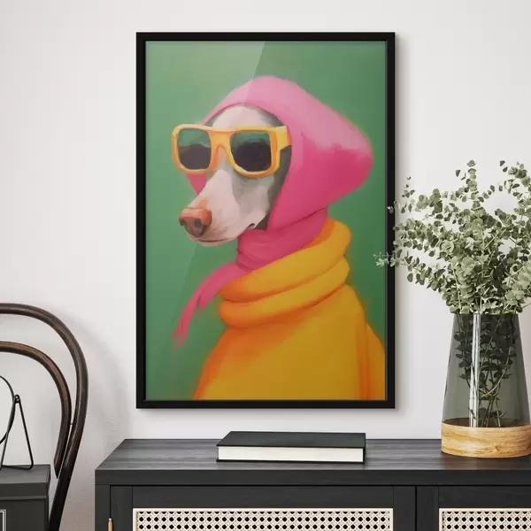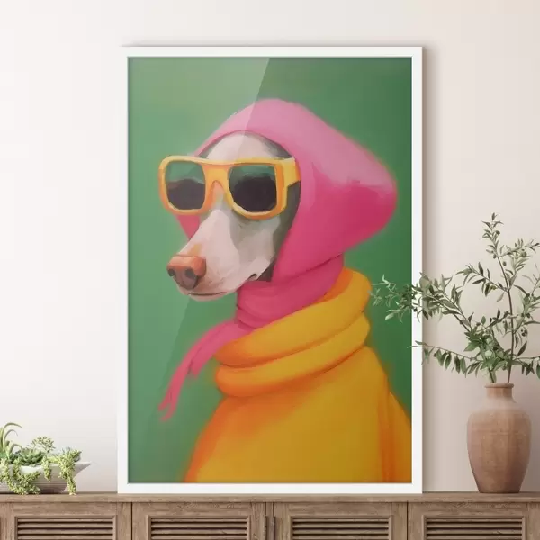 Poster Stijlvolle hond in felle kleren Nr f43265