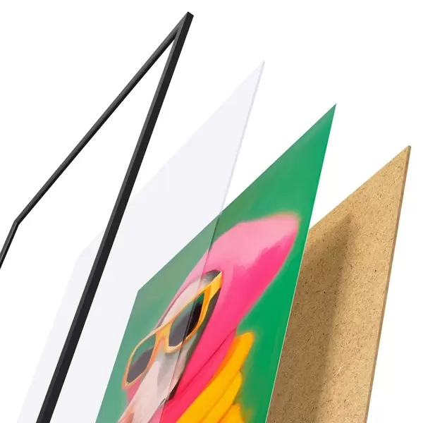 De poster bestaat uit een frame, plexiglas, geprinte afbeelding en spaanplaat achterkant. De poster kan meteen aan de muur worden gehangen dankzij de bevestigingen op de achterkant.
