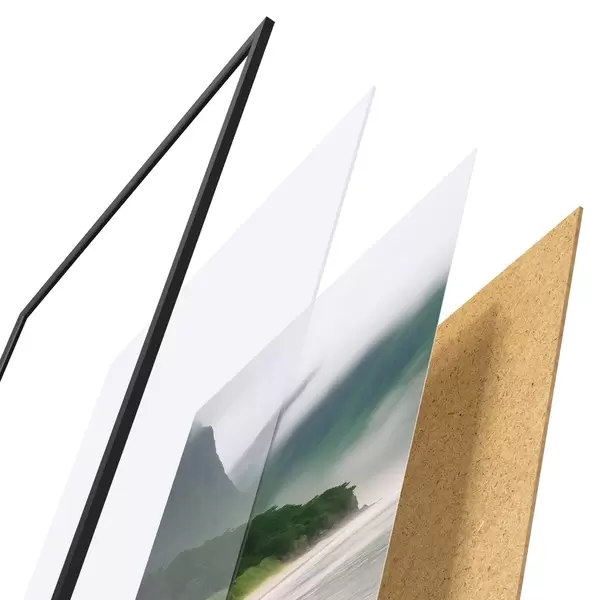 De poster bestaat uit een frame, plexiglas, geprinte afbeelding en spaanplaat achterkant. De poster kan meteen aan de muur worden gehangen dankzij de bevestigingen op de achterkant.