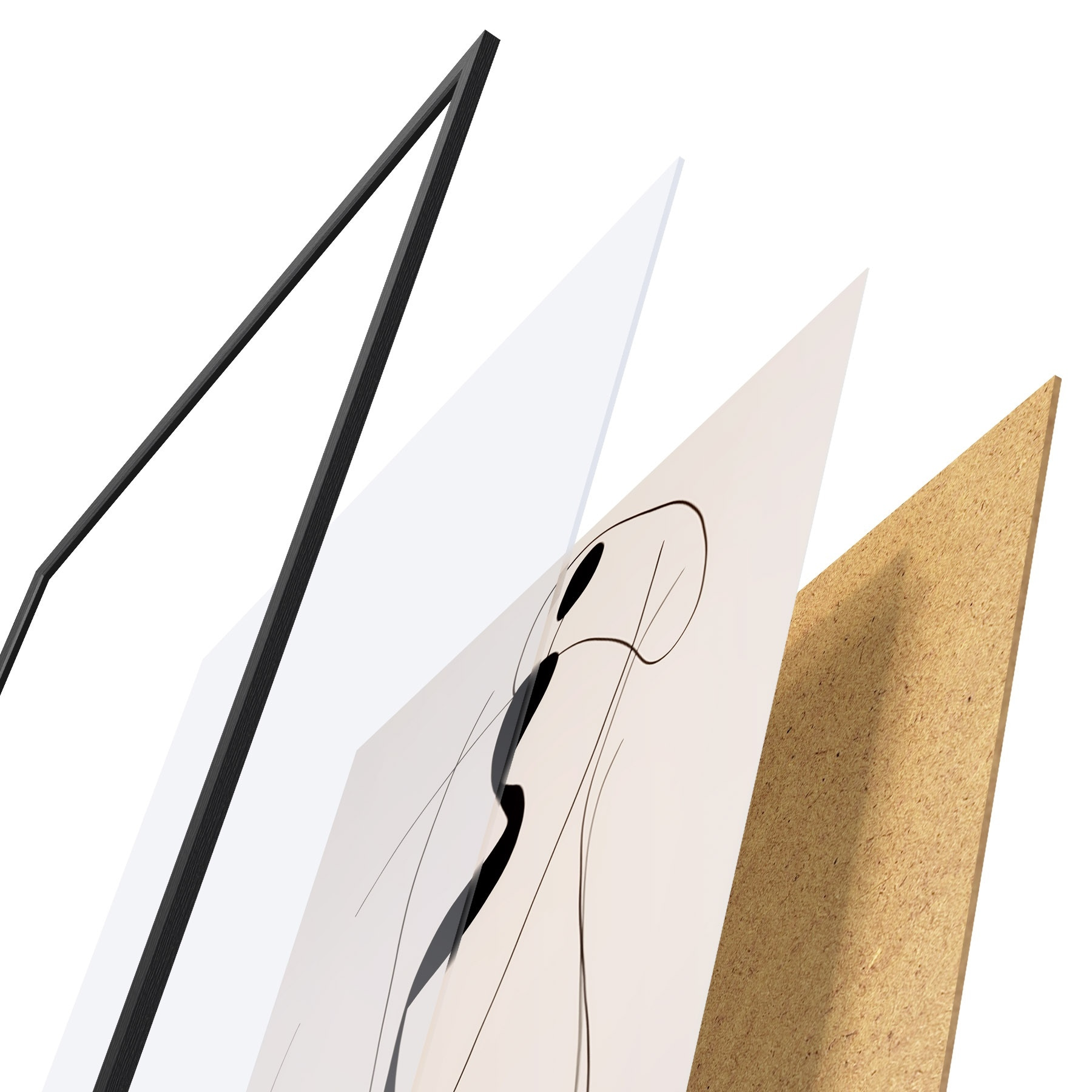 De poster bestaat uit een frame, plexiglas, geprinte afbeelding en spaanplaat achterkant. De poster kan meteen aan de muur worden gehangen dankzij de bevestigingen op de achterkant.