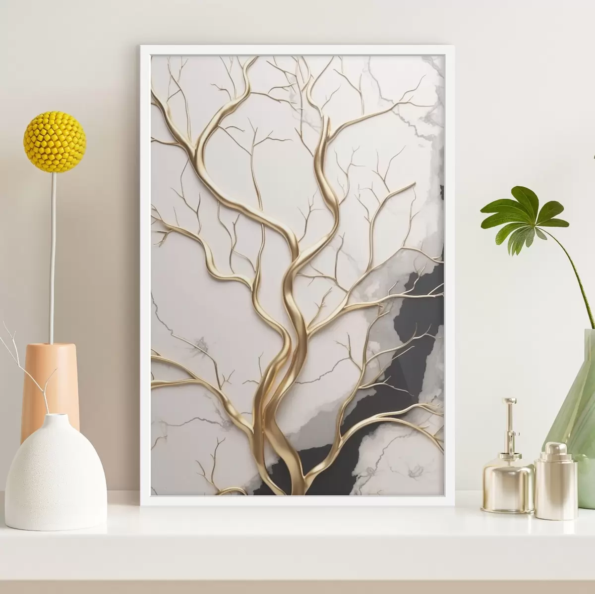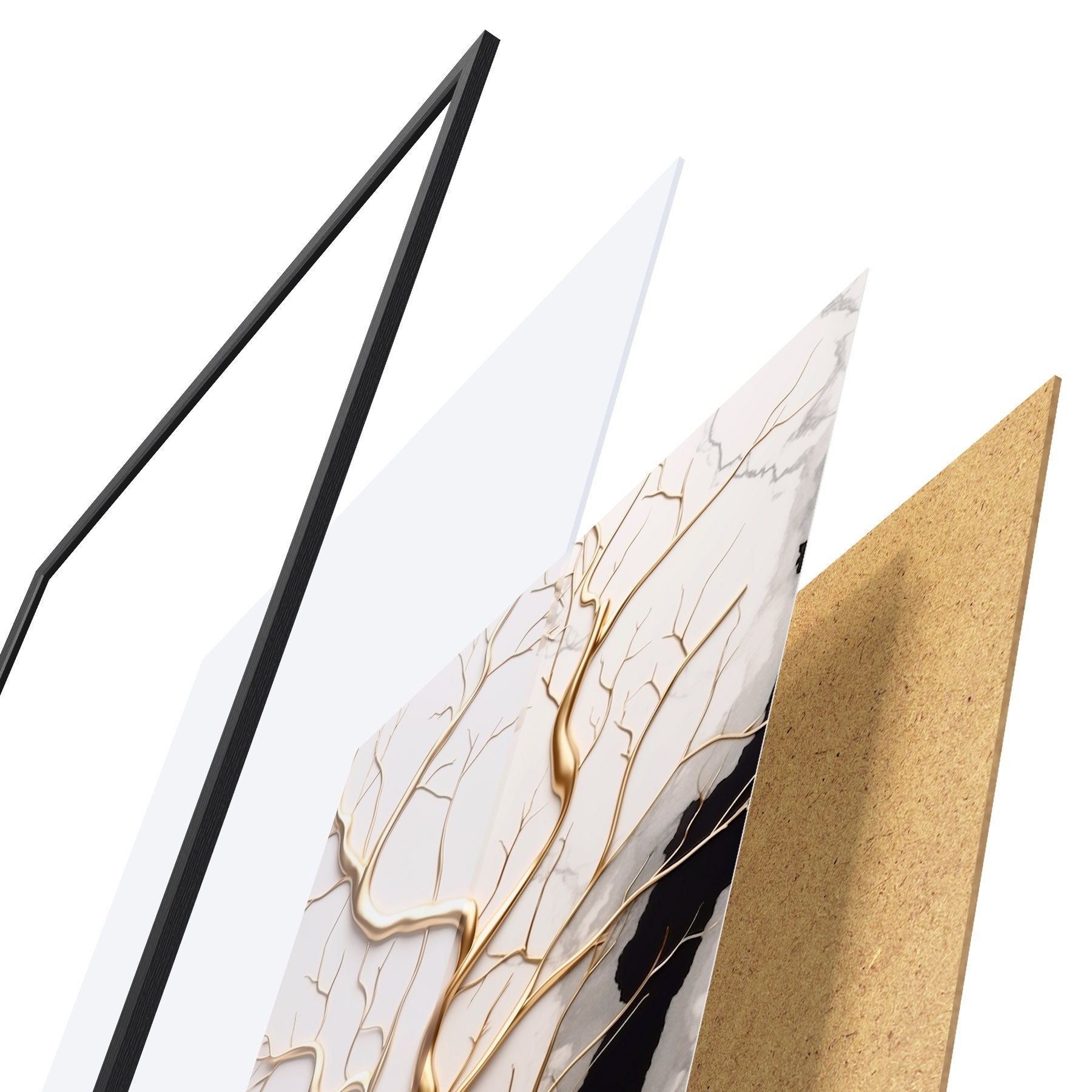 De poster bestaat uit een frame, plexiglas, geprinte afbeelding en spaanplaat achterkant. De poster kan meteen aan de muur worden gehangen dankzij de bevestigingen op de achterkant.