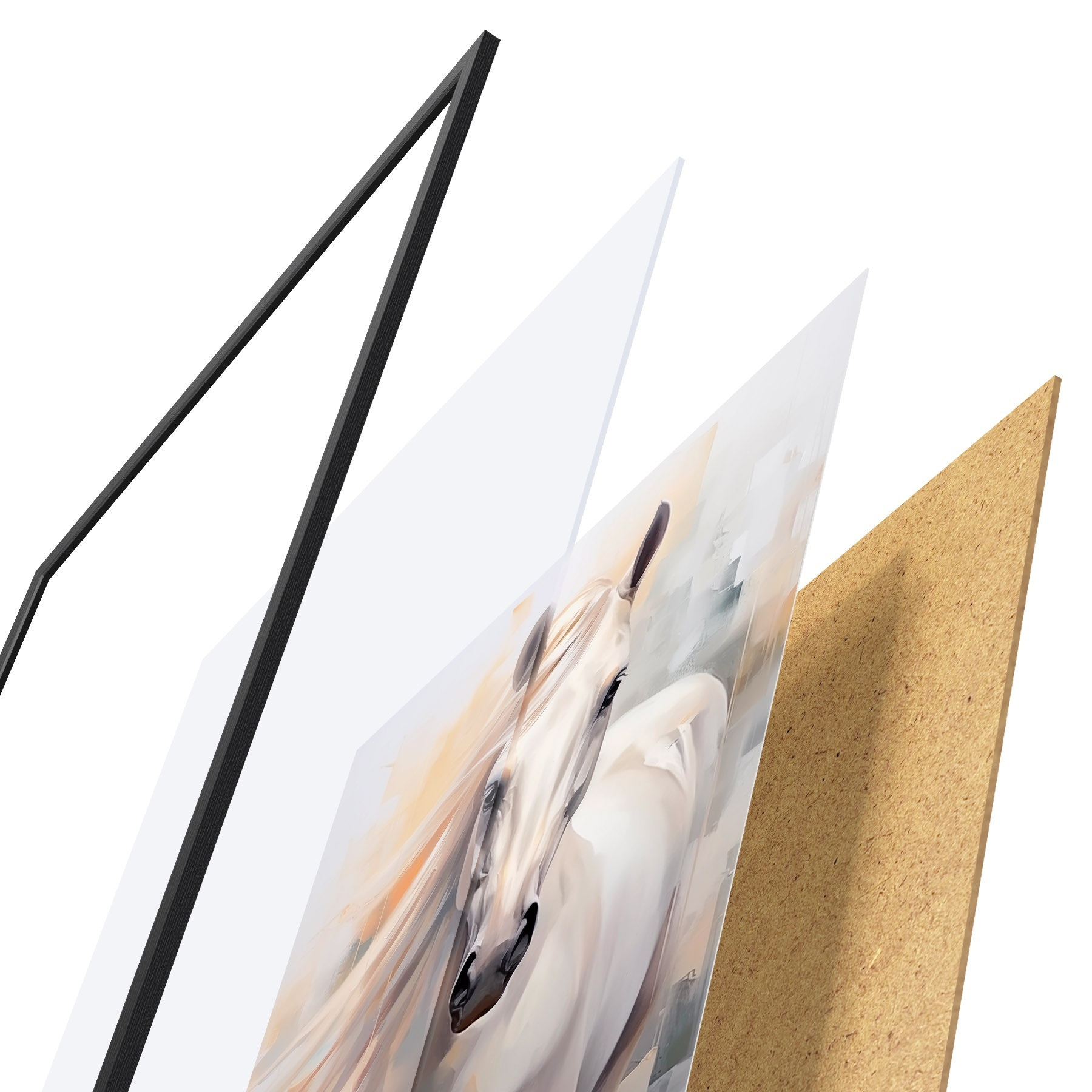 De poster bestaat uit een frame, plexiglas, geprinte afbeelding en spaanplaat achterkant. De poster kan meteen aan de muur worden gehangen dankzij de bevestigingen op de achterkant.