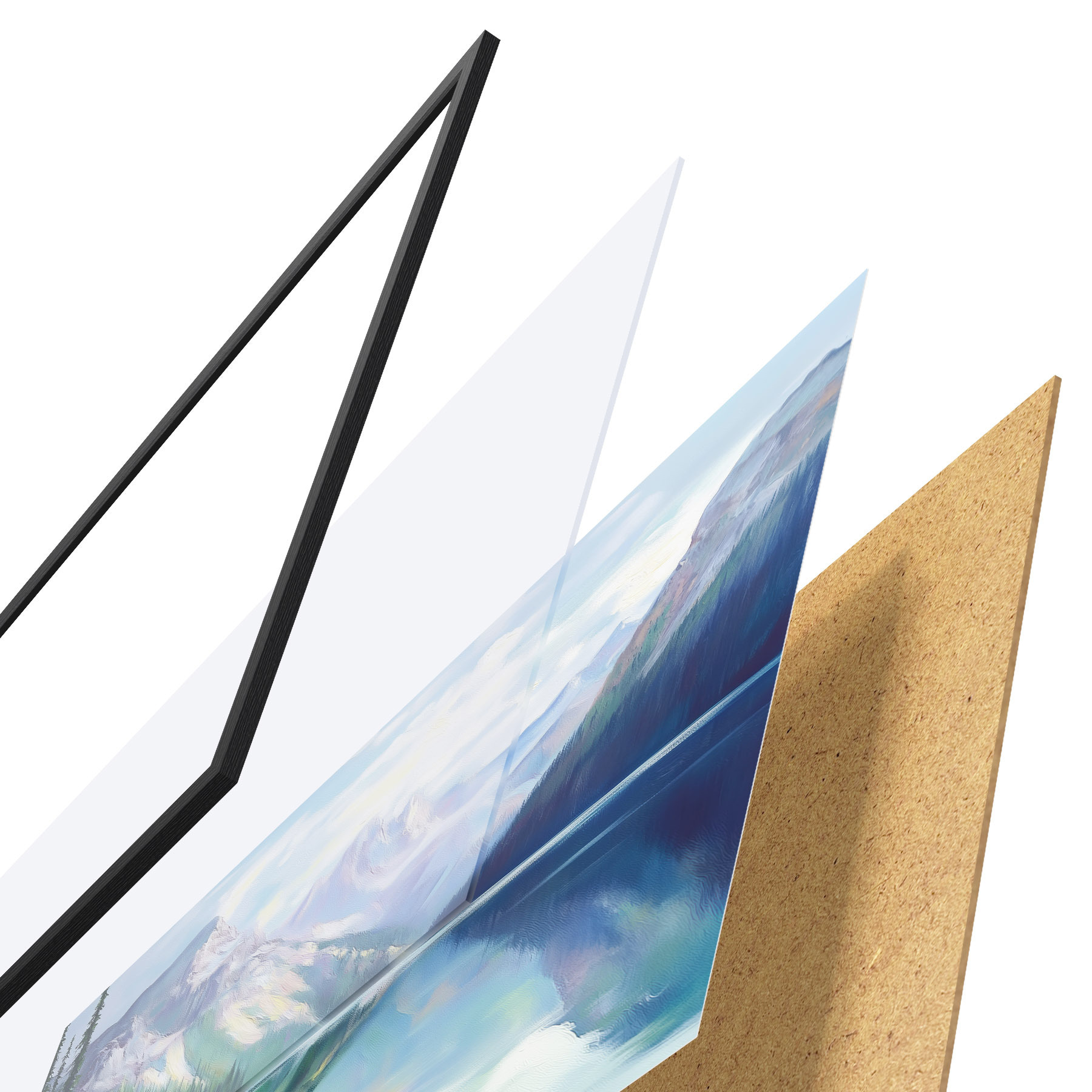 De poster bestaat uit een frame, plexiglas, geprinte afbeelding en spaanplaat achterkant. De poster kan meteen aan de muur worden gehangen dankzij de bevestigingen op de achterkant.