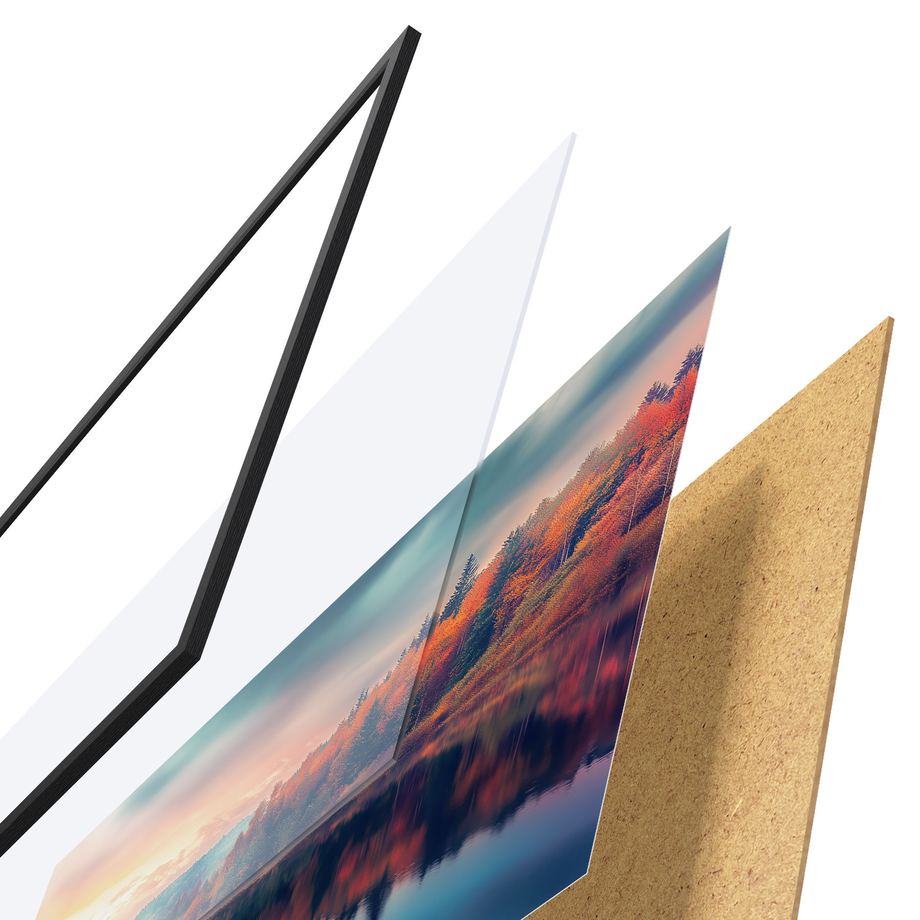 De poster bestaat uit een frame, plexiglas, geprinte afbeelding en spaanplaat achterkant. De poster kan meteen aan de muur worden gehangen dankzij de bevestigingen op de achterkant.