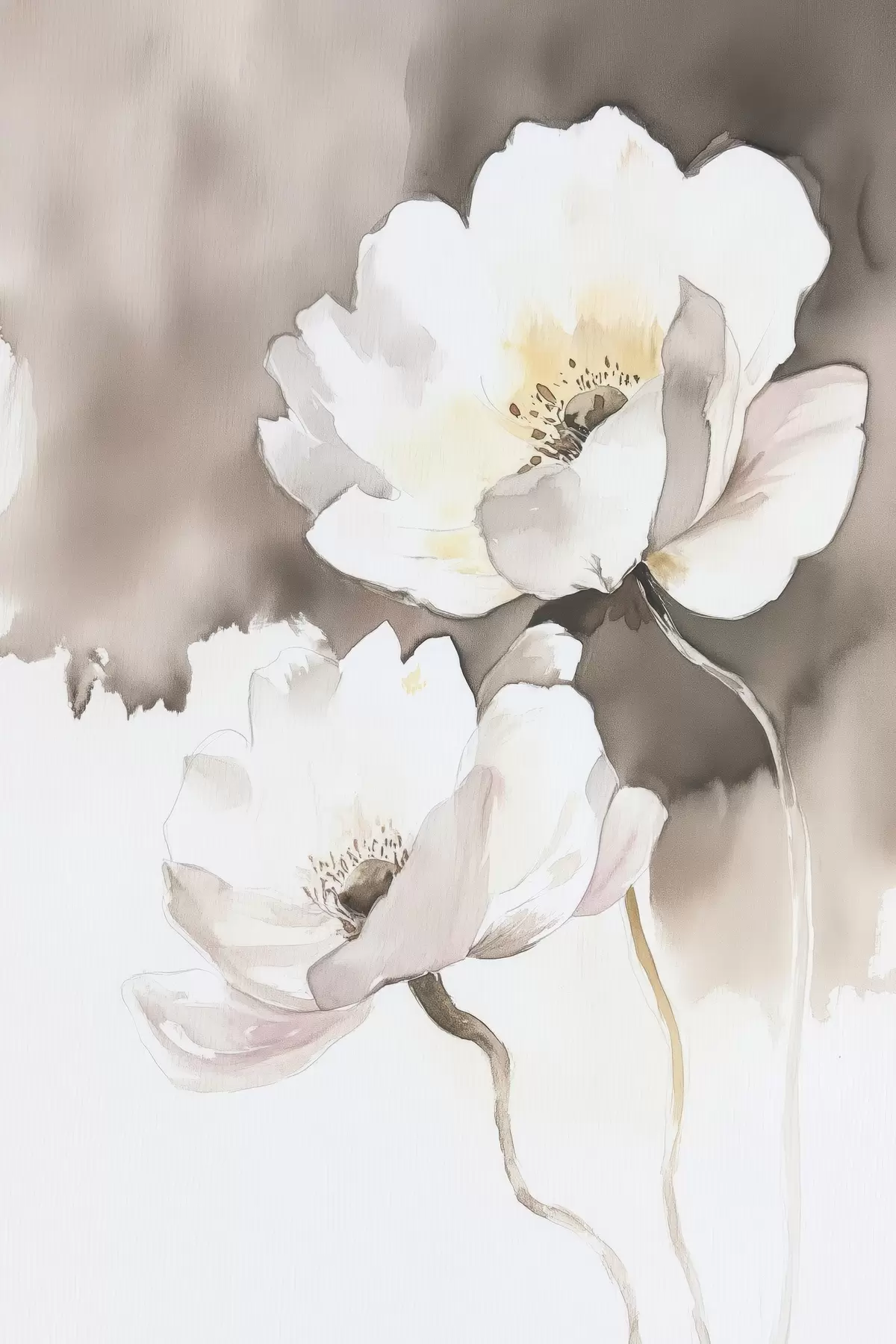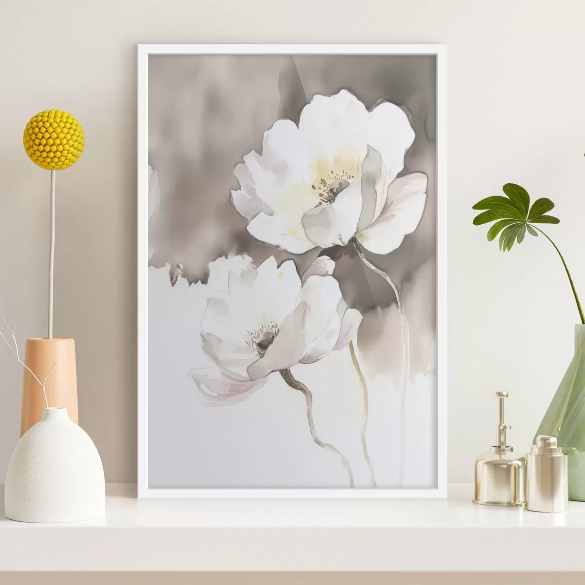 Poster Witte bloemen op een bruine achtergrond in de stijl van aquarelverf Nr f43297