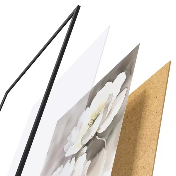 De poster bestaat uit een frame, plexiglas, geprinte afbeelding en spaanplaat achterkant. De poster kan meteen aan de muur worden gehangen dankzij de bevestigingen op de achterkant.