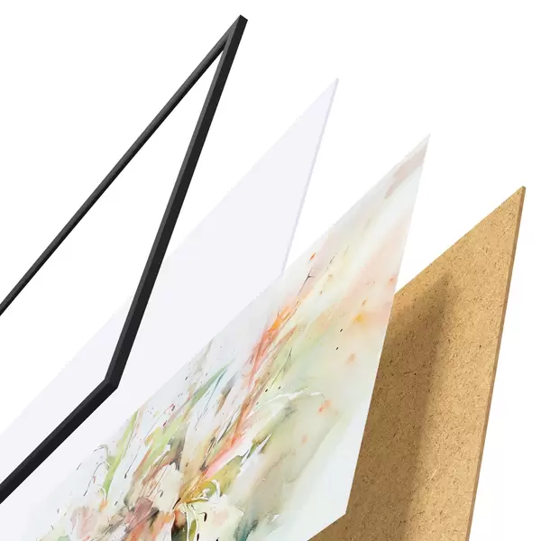 De poster bestaat uit een frame, plexiglas, geprinte afbeelding en spaanplaat achterkant. De poster kan meteen aan de muur worden gehangen dankzij de bevestigingen op de achterkant.