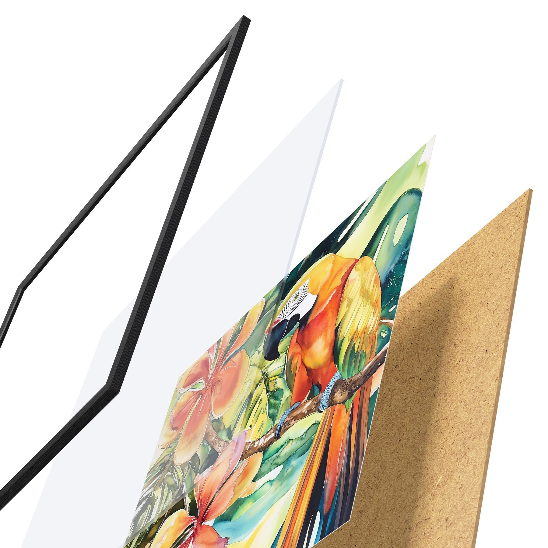 De poster bestaat uit een frame, plexiglas, geprinte afbeelding en spaanplaat achterkant. De poster kan meteen aan de muur worden gehangen dankzij de bevestigingen op de achterkant.