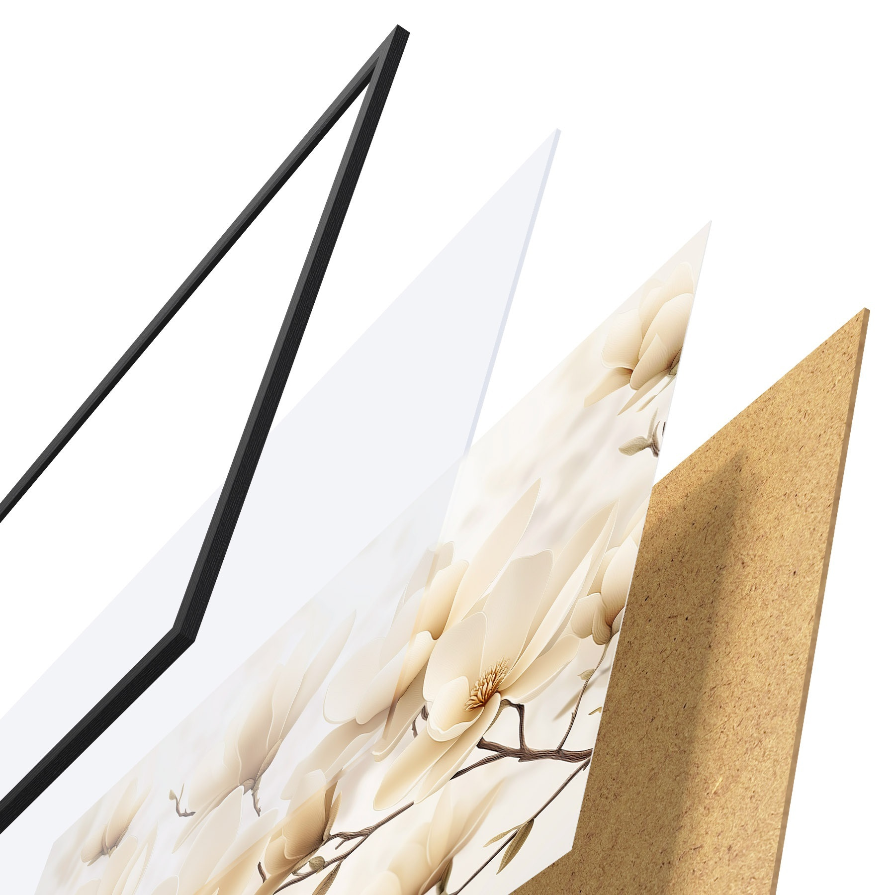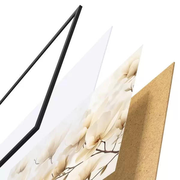 De poster bestaat uit een frame, plexiglas, geprinte afbeelding en spaanplaat achterkant. De poster kan meteen aan de muur worden gehangen dankzij de bevestigingen op de achterkant.