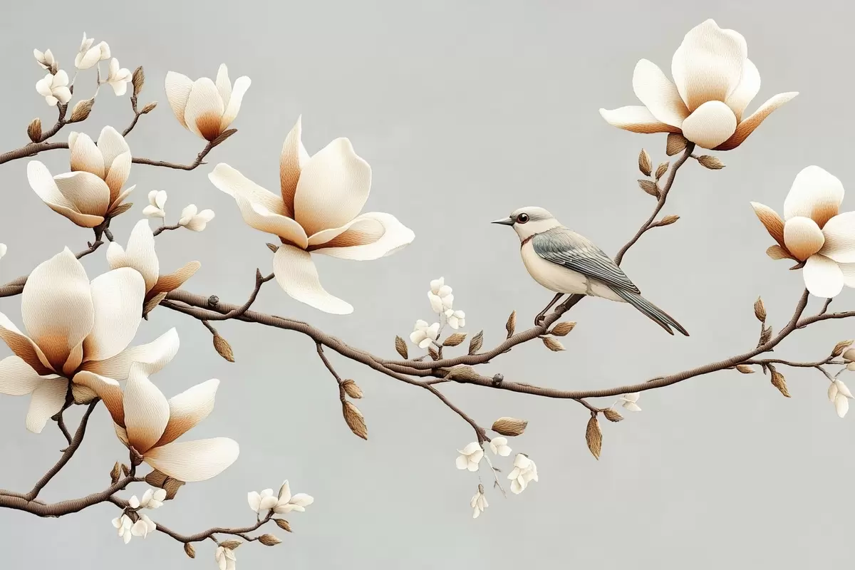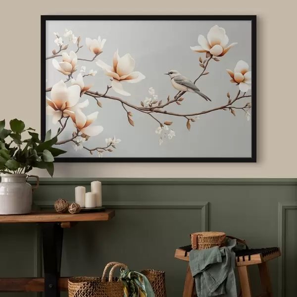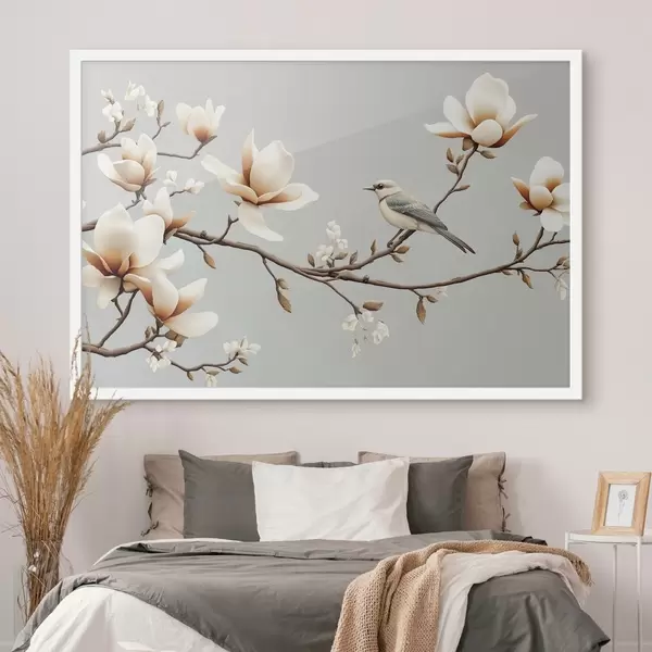 Poster Vogel op een tak met magnolia's in zachte pastelkleuren f43320