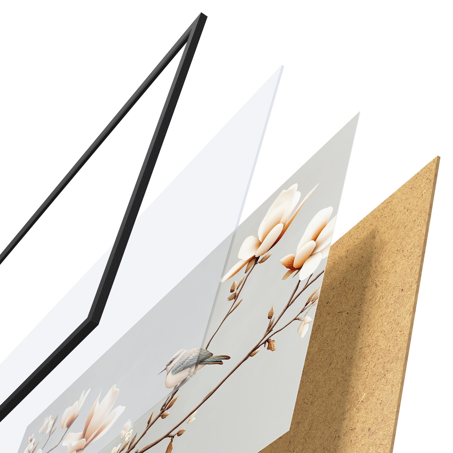 De poster bestaat uit een frame, plexiglas, geprinte afbeelding en spaanplaat achterkant. De poster kan meteen aan de muur worden gehangen dankzij de bevestigingen op de achterkant.