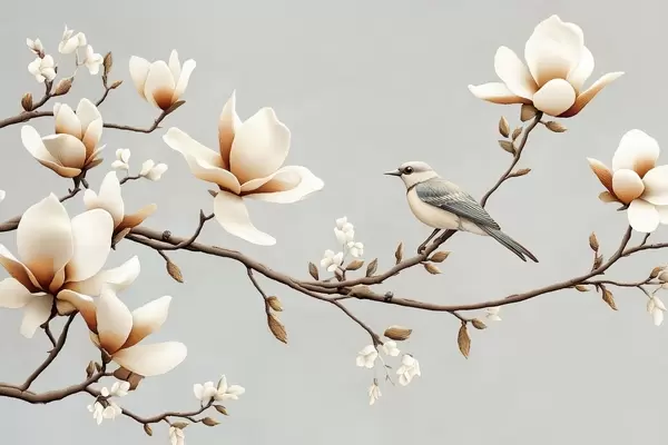 Poster Vogel op een tak met magnolia's in zachte pastelkleuren Nr f43320