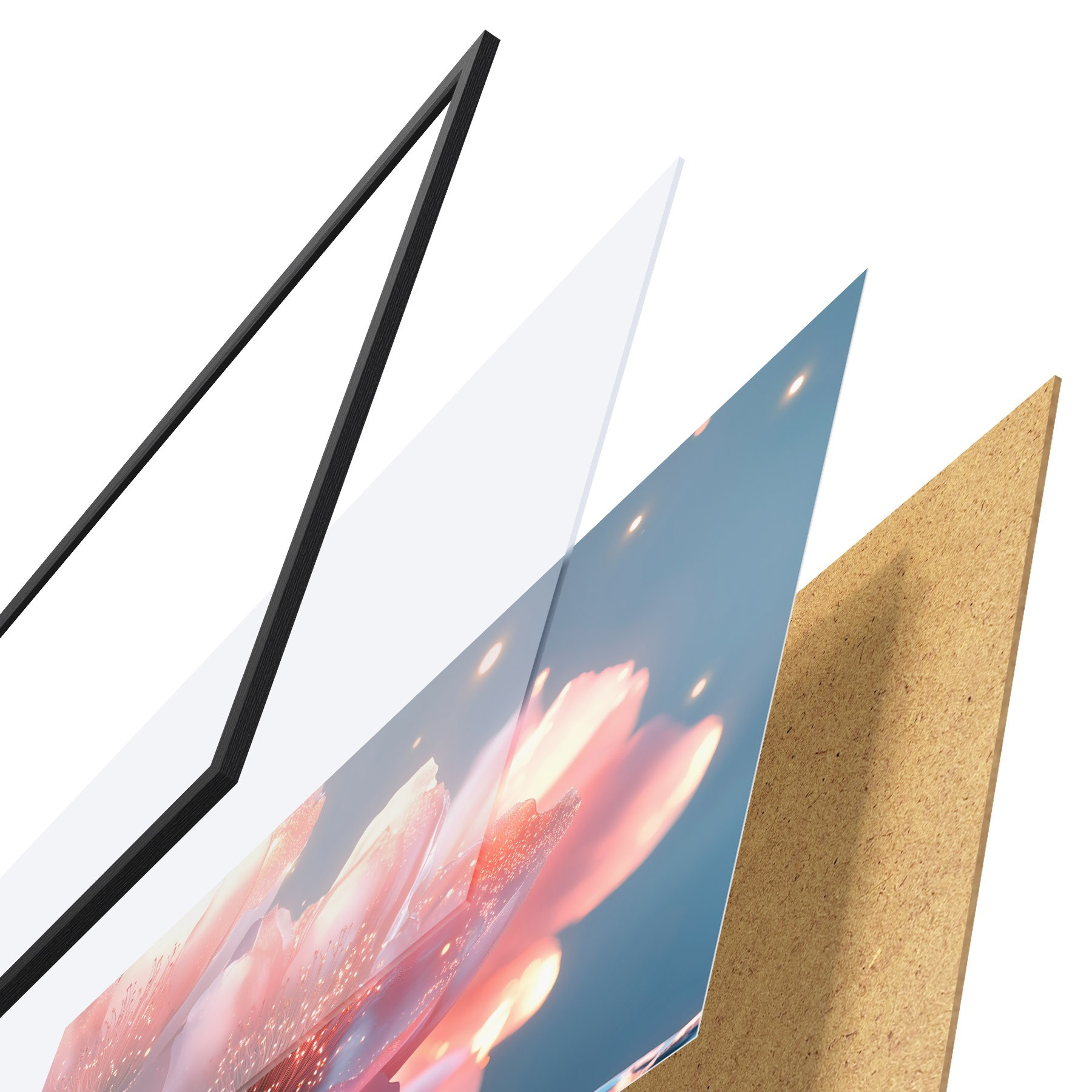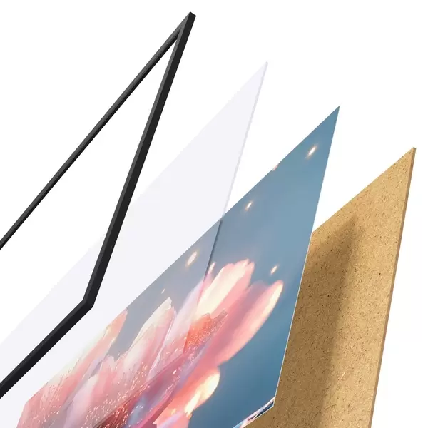 De poster bestaat uit een frame, plexiglas, geprinte afbeelding en spaanplaat achterkant. De poster kan meteen aan de muur worden gehangen dankzij de bevestigingen op de achterkant.