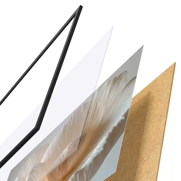 De poster bestaat uit een frame, plexiglas, geprinte afbeelding en spaanplaat achterkant. De poster kan meteen aan de muur worden gehangen dankzij de bevestigingen op de achterkant.