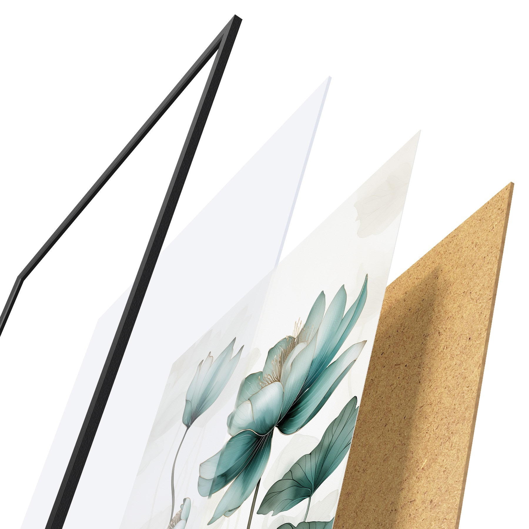 De poster bestaat uit een frame, plexiglas, geprinte afbeelding en spaanplaat achterkant. De poster kan meteen aan de muur worden gehangen dankzij de bevestigingen op de achterkant.
