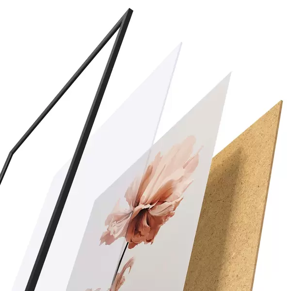 De poster bestaat uit een frame, plexiglas, geprinte afbeelding en spaanplaat achterkant. De poster kan meteen aan de muur worden gehangen dankzij de bevestigingen op de achterkant.