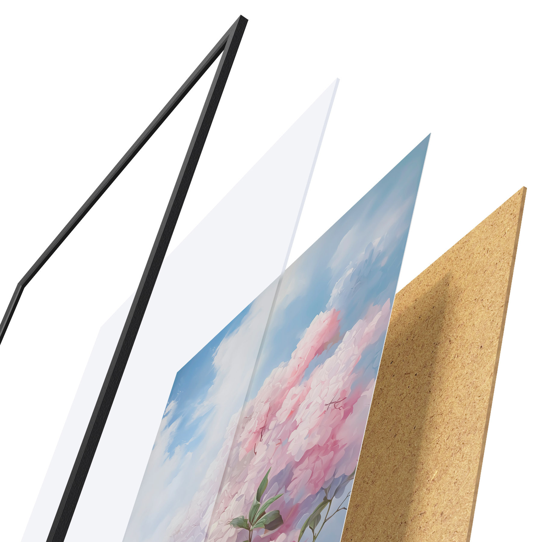 De poster bestaat uit een frame, plexiglas, geprinte afbeelding en spaanplaat achterkant. De poster kan meteen aan de muur worden gehangen dankzij de bevestigingen op de achterkant.