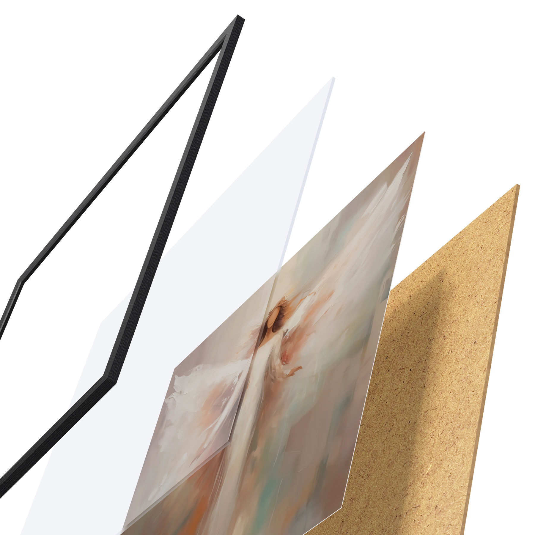 De poster bestaat uit een frame, plexiglas, geprinte afbeelding en spaanplaat achterkant. De poster kan meteen aan de muur worden gehangen dankzij de bevestigingen op de achterkant.