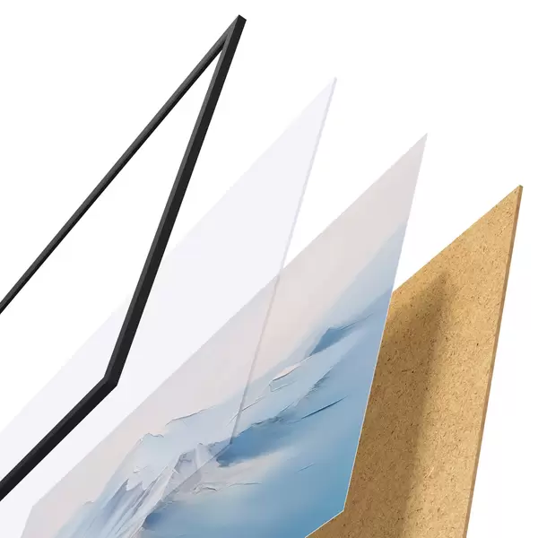 De poster bestaat uit een frame, plexiglas, geprinte afbeelding en spaanplaat achterkant. De poster kan meteen aan de muur worden gehangen dankzij de bevestigingen op de achterkant.