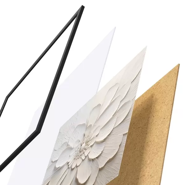De poster bestaat uit een frame, plexiglas, geprinte afbeelding en spaanplaat achterkant. De poster kan meteen aan de muur worden gehangen dankzij de bevestigingen op de achterkant.