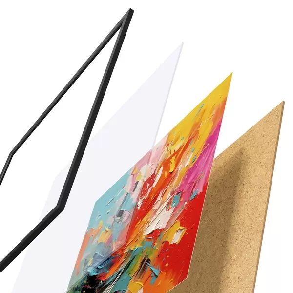 De poster bestaat uit een frame, plexiglas, geprinte afbeelding en spaanplaat achterkant. De poster kan meteen aan de muur worden gehangen dankzij de bevestigingen op de achterkant.