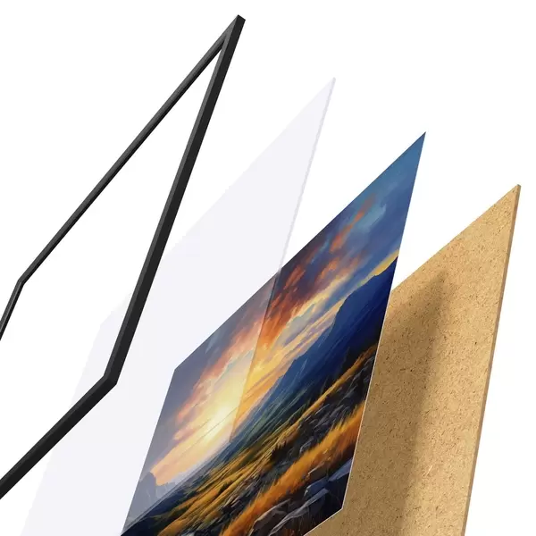 De poster bestaat uit een frame, plexiglas, geprinte afbeelding en spaanplaat achterkant. De poster kan meteen aan de muur worden gehangen dankzij de bevestigingen op de achterkant.