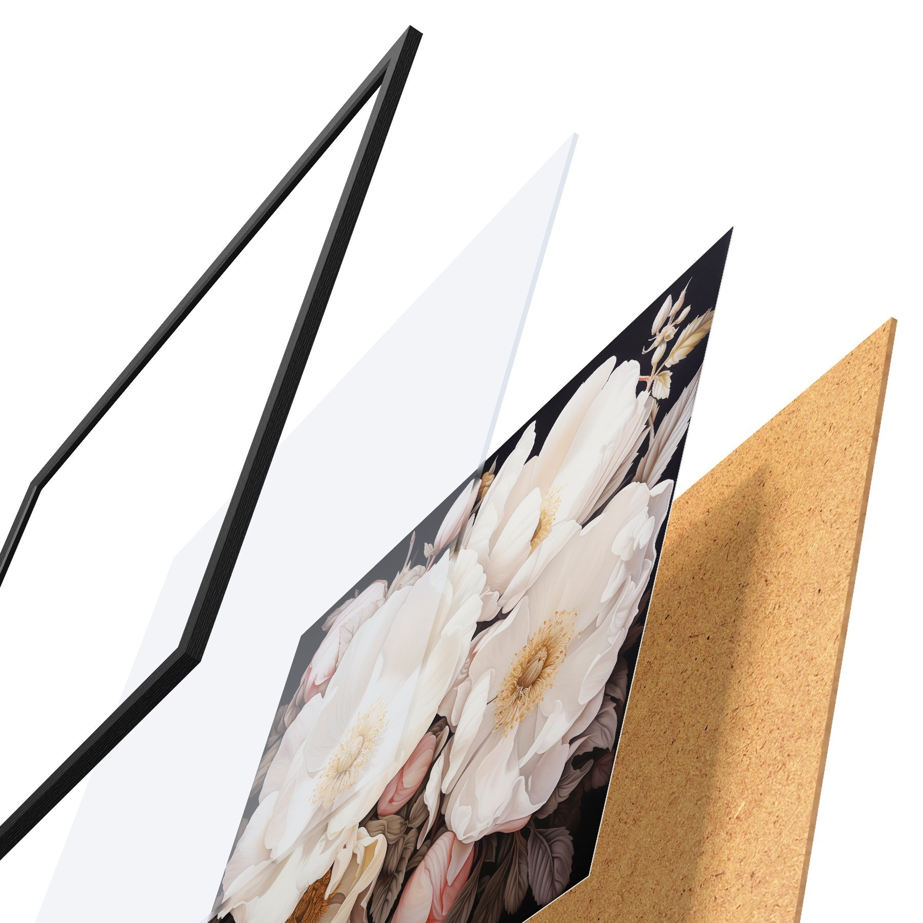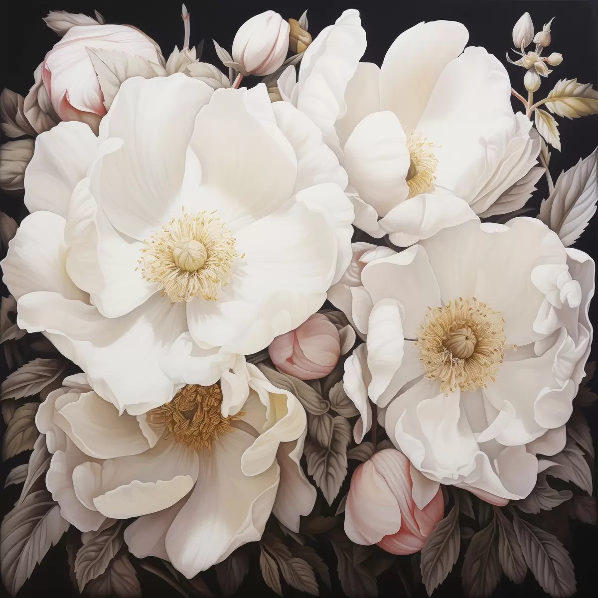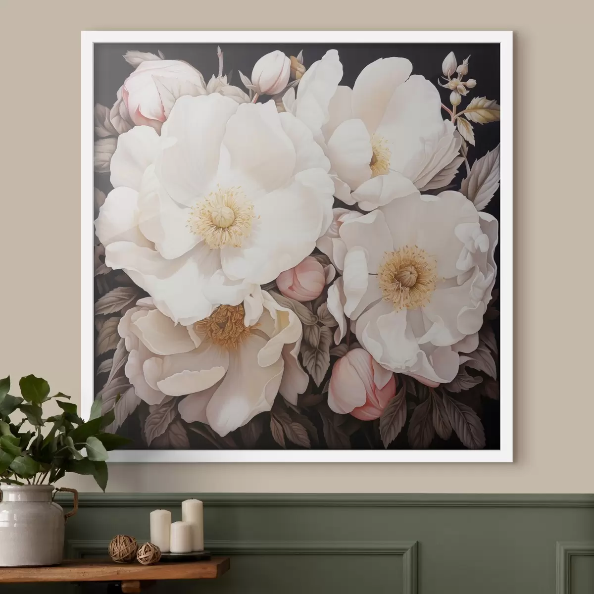 Poster Witte pioen bloemen op een donkere achtergrond in acryl schilderij stijl Nr f43379