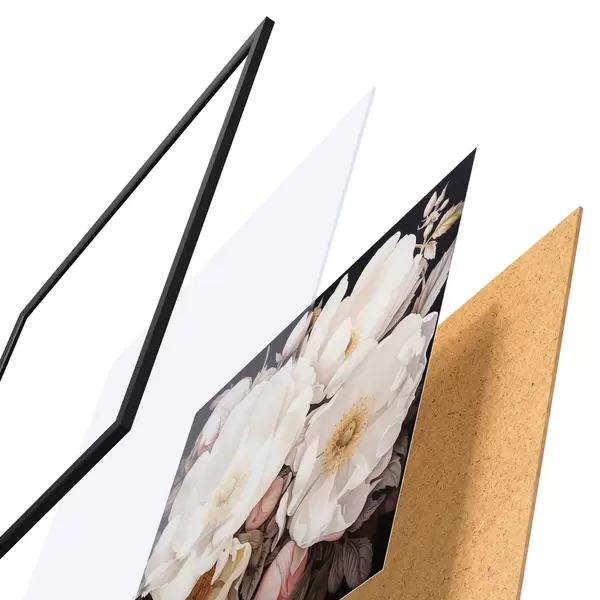 De poster bestaat uit een frame, plexiglas, geprinte afbeelding en spaanplaat achterkant. De poster kan meteen aan de muur worden gehangen dankzij de bevestigingen op de achterkant.