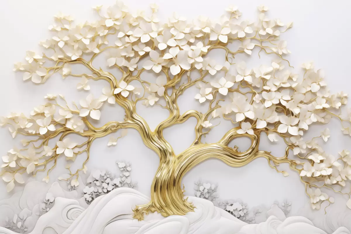 Poster Decoratieve boom met witte bloemen, witte achtergrond, witte rotsen, ingewikkelde details, op de natuur geïnspireerde kunst Nr f43388