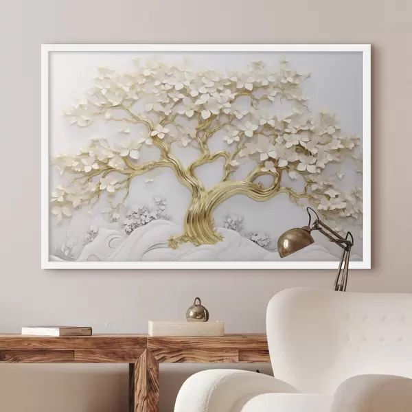 Poster Decoratieve boom met witte bloemen, witte achtergrond, witte rotsen, ingewikkelde details, op de natuur geïnspireerde kunst f43388