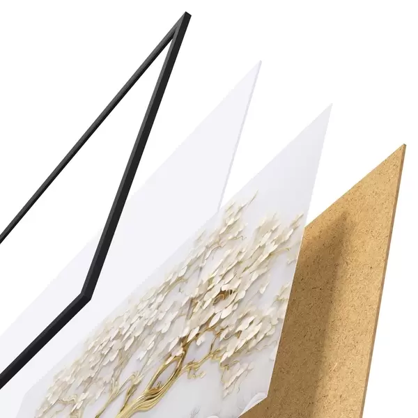 De poster bestaat uit een frame, plexiglas, geprinte afbeelding en spaanplaat achterkant. De poster kan meteen aan de muur worden gehangen dankzij de bevestigingen op de achterkant.