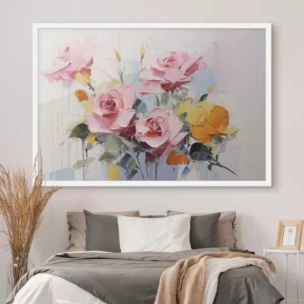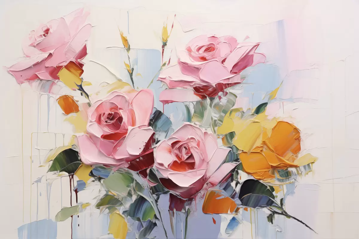 Poster Moderne abstracte kunst van roze en gele rozen met bladeren, dikke penseelstreken, imitatie olieverfschilderij, pastelkleuren Nr f43392